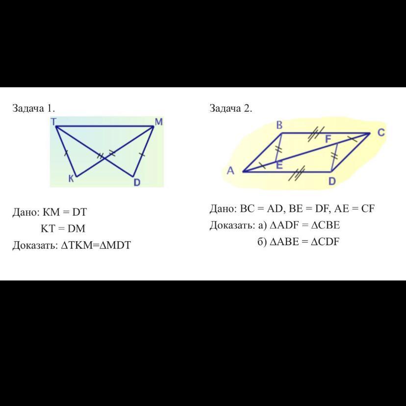 задача1: так как КМ=DT; KT=DM и МТ общая сторона, следует что треуг.ТКМ=треуг.МDT.