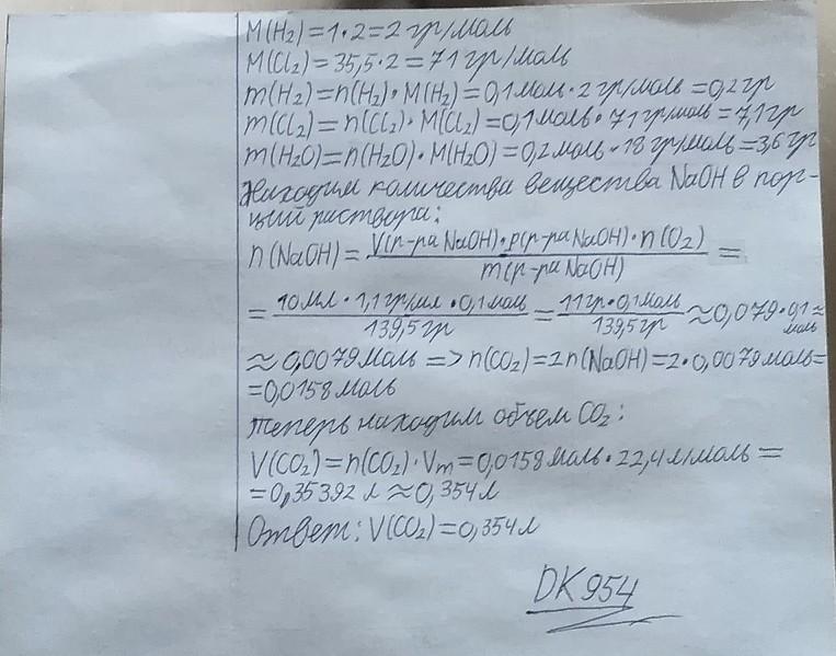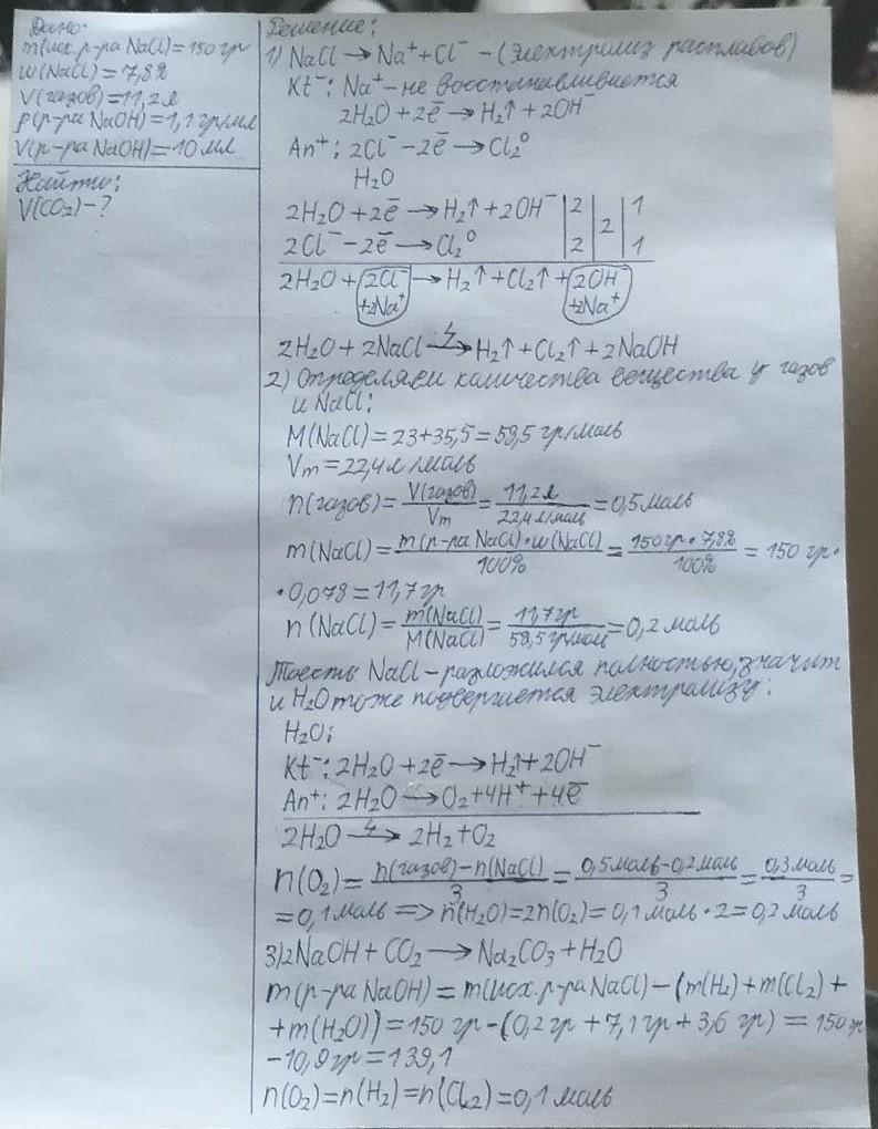 В результате электролиза 150 г раствора хлорида натрия с массовой долей Соли 7.8% на электродах выделилось 11.2 л (н.у.) газов и образовался раствор с плотностью 1,1 г/мл. Какой максимальный объём оксида углерода (ІV) при нормальных условиях прореагирует с 10 мл полученного раствора?