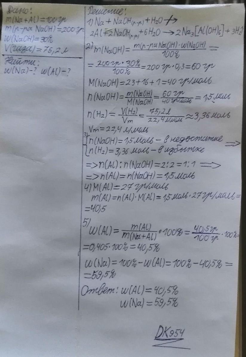 При добавлении к 100 г смеси натрия и алюминия 200 г 30% раствора гидроксид натрия выделилось 75,2 л газа при н.у.