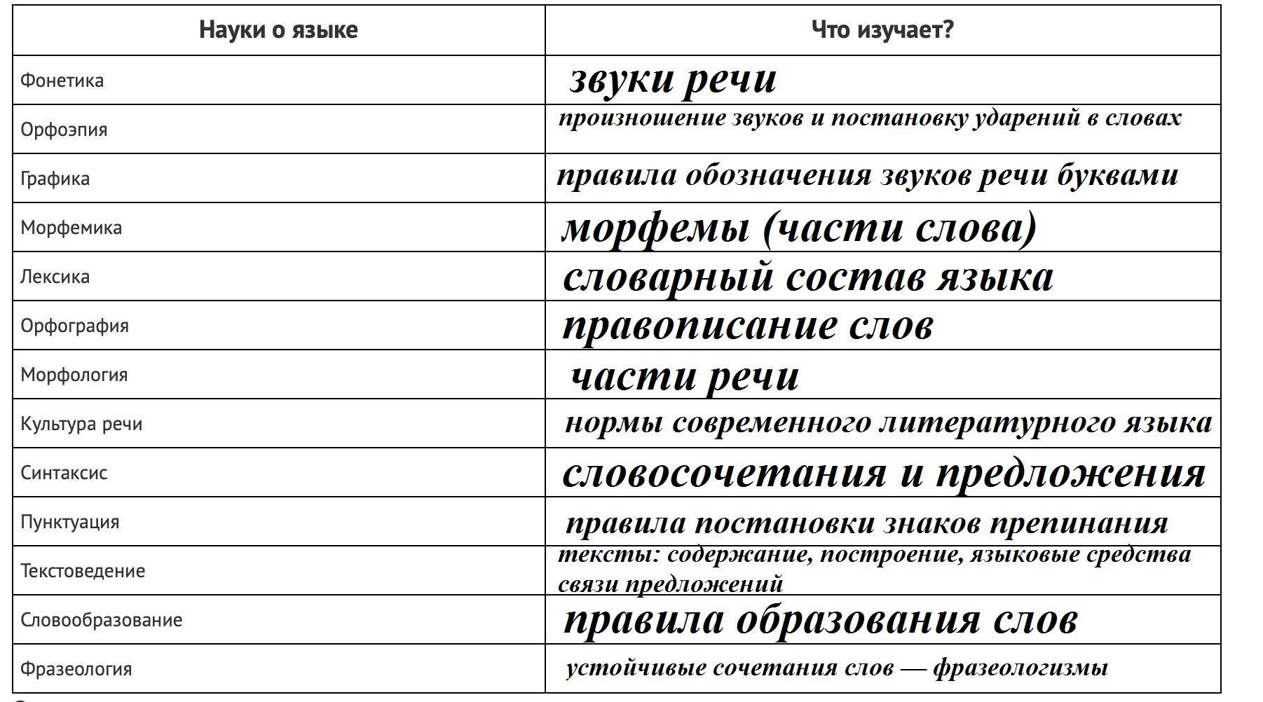 Найдите соответствия. Таблицу запишите, включая названия наук о языке первой колонки (их также нужно прописать) и заполняя вторую правильными ответами.