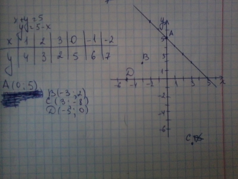Из точек А(0;5), В(-3;2), С(3;-8) и D(-5;0)Из точек А(0;5), В(-3;2), С(3;-8) и D(-5;0) выберите те, которые принадлежат графику зависимости Х+У=-5.