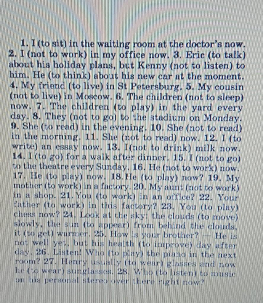 8. They does not go... 9. She reads... 10. She does not read... 11. She is not reading... 12. I am writting... 13. I am not drinking... 14. I go... 15. I don't go... 16. He is not working... 17. He is playing... 18. Is he playing now? 19. My mother works... 20. My aunt does not work... 21. Do you work..? 22. Does your father work..? 23. Are you playing..? 24. Look at the sky: the clouds are moving slowly, the sun is appearing from behind the clouds, it is getting warmer. 25. his health improves... 26. Who is playing... 27. usually wears glasses and now he is wearing... 28. Who is listening...