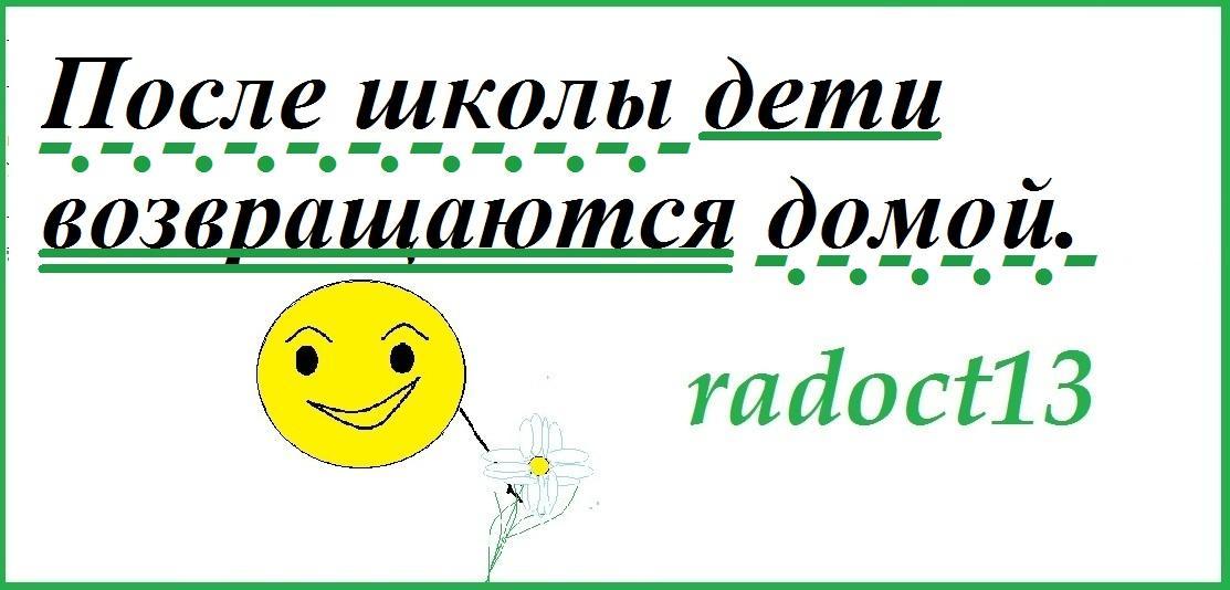 После школы (когда? обстоятельство времени, выражено сущ. с предлогом, подчёркиваем точка тире) дети (кто? подлежащее, выражено сущ., подчёркиваем 1 чертой) возвращаются (что делают? сказуемое, выражено глаг., подчёркиваем 2 чертами) домой (куда? обстоятельство места, выражено нареч., подчёркиваем точка тире).