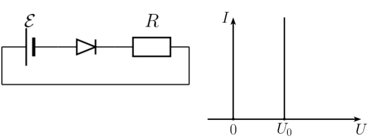 Электрическая цепь состоит из источника ЭДС = 3 В, резистора с сопротивлением R = 2 Ом и неидельного диода вольт-амперная характеристика которого представлена на рисунке. Известно, что мощность тепловых потерь, которые выделяются на диоде равна 1 Вт. Чему может быть равно значение напряжения U0, при котором открывается диод?