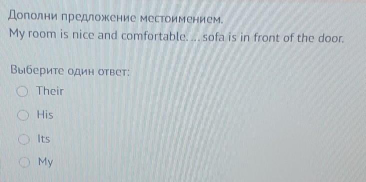 My room is nice and comfortable. ... sofa is in front of the door 1) Their 2)His 3) Its 4) My