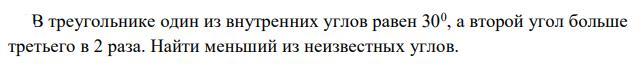 Пускай меньший угол равен x, тогда второй угол равен 2х, а третий угол равен 30.Сума углов треугольника равна 180 градусов. Имеем уровнение: