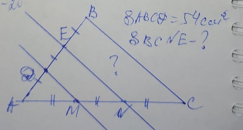 Площадь треугольника ABC равна 54 см в квадрате. На стороне AB обозначили точки D и E так, что AD = DE = BE, а на стороне AC - точки M и N так, что AM = MN = NC. Найдите площадь четырехугольника BCNE