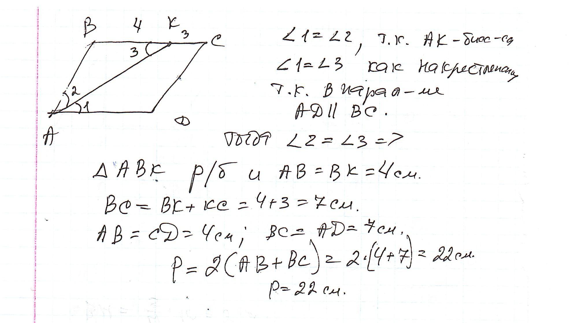 12. У паралелограмі АВСD бісектриса кута А поділяе сторону ВС на відрізки ВК %34 смі КС-3 см. Знайдіть периметр паралелограма.