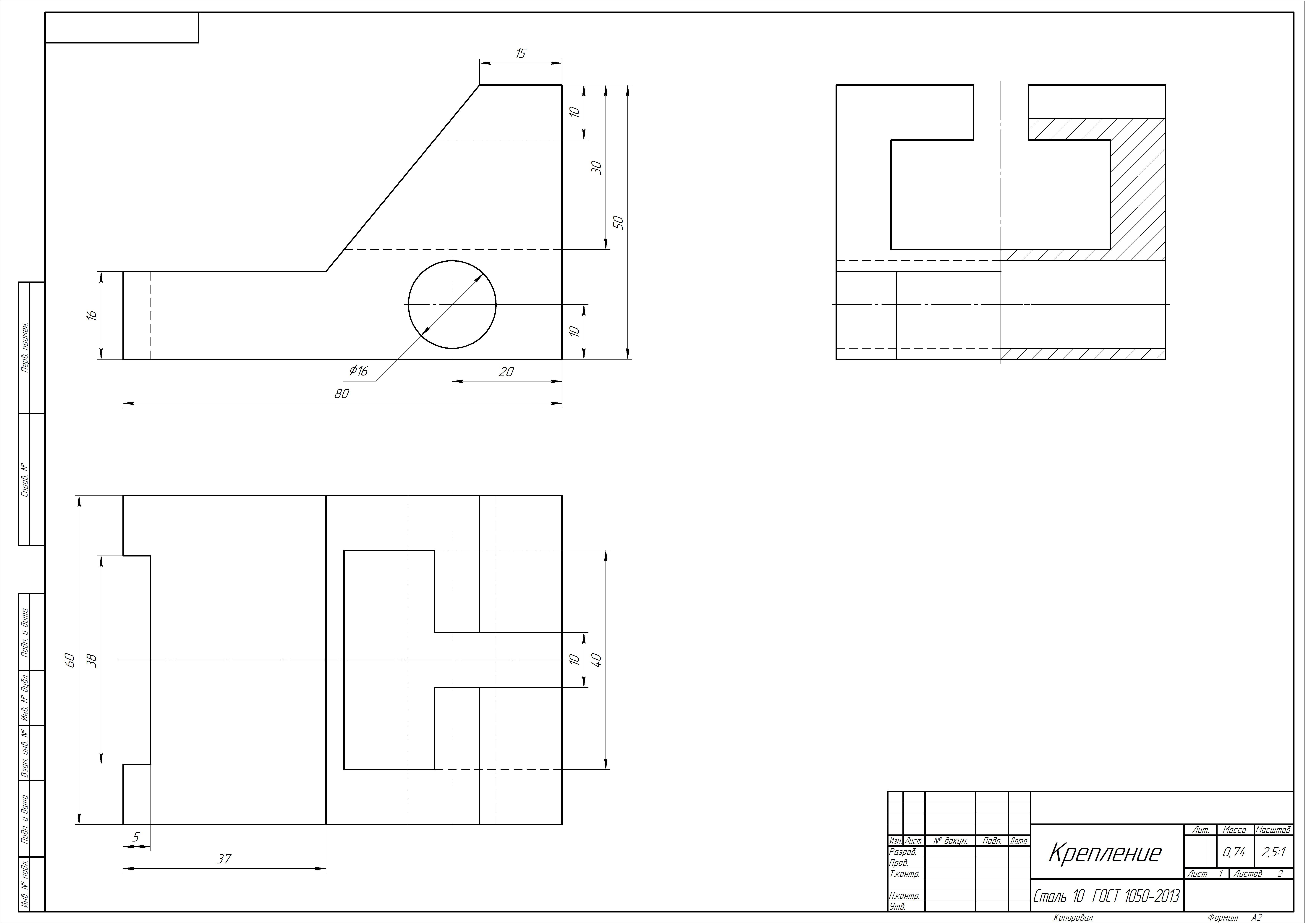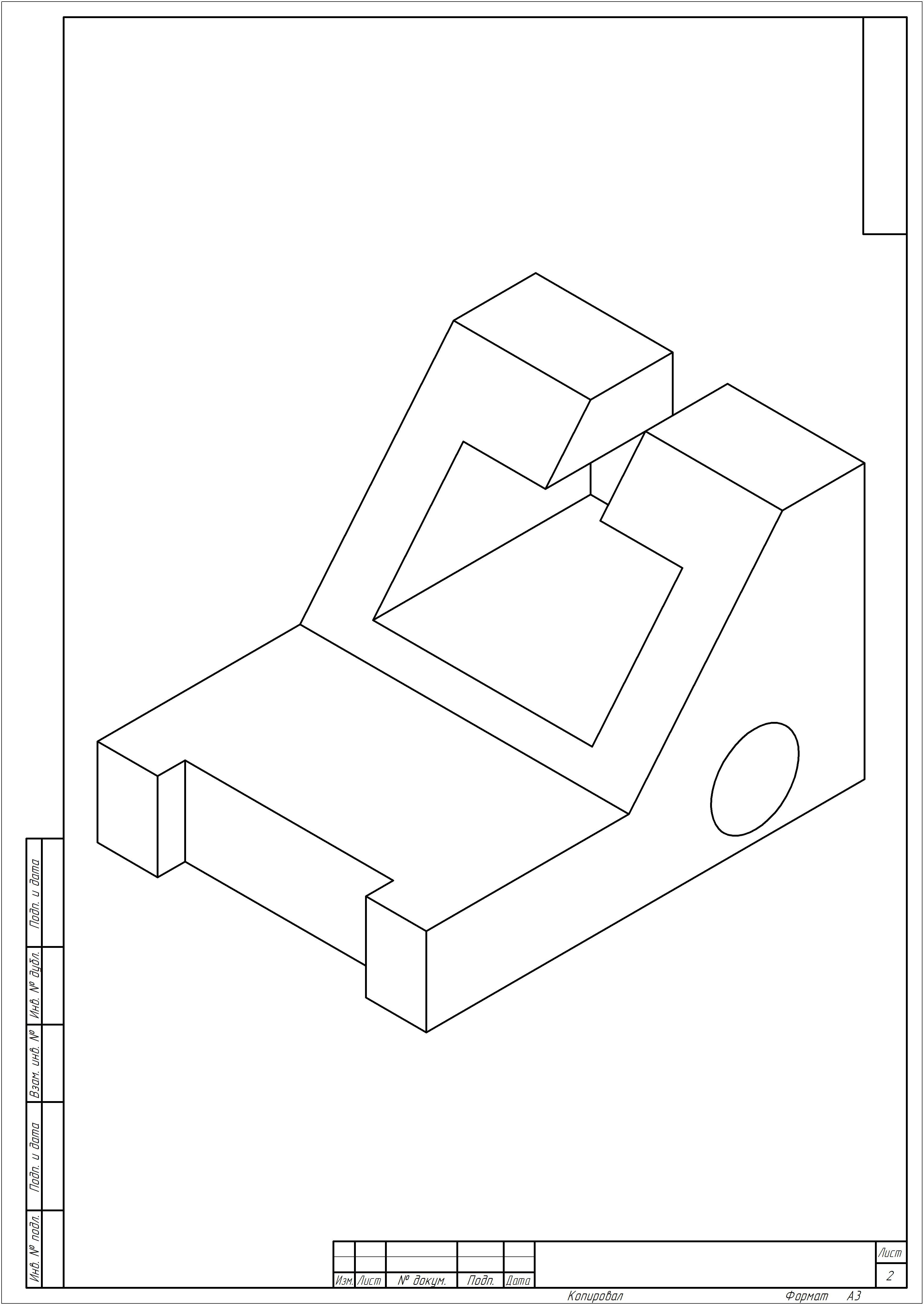 построить 3 вид по 2 имеющимся, сделать необходимые разрезы и построить аксонометрическую проекцию
