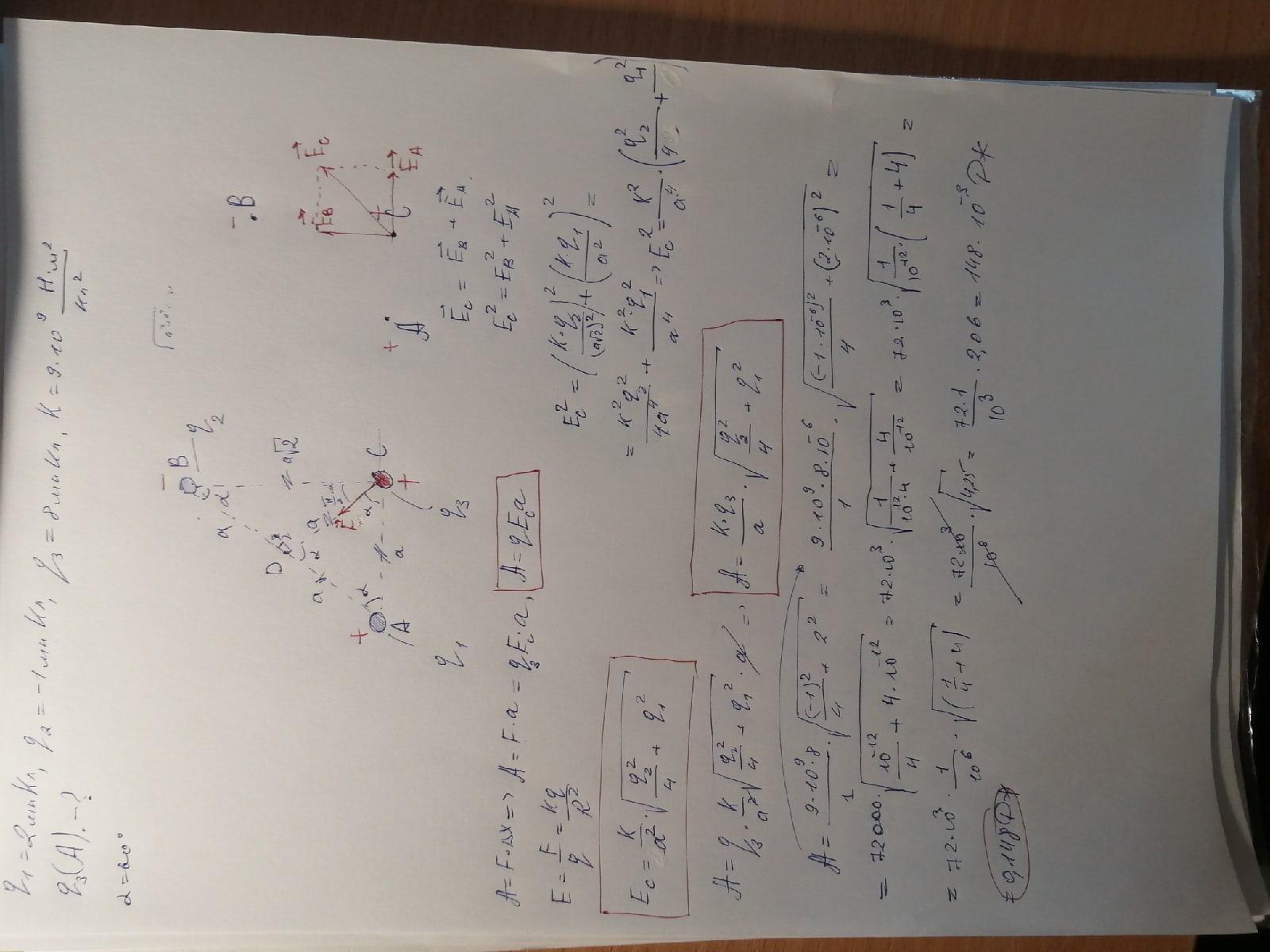 Три точечных заряда (q1=2мкКл, q2=-1мкКл, q3=8мкКл) закреплены в вершинах равнобедренного прямоугольного треугольника как показано на рисунке. Коэффициент пропорциональности в законе Кулона k=9*10^9 (Н*м^2)/(Кл^2).