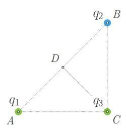 Какую работу нужно совершить, чтобы перенести заряд q3 вдоль медианы CD , длина которой a=1м.