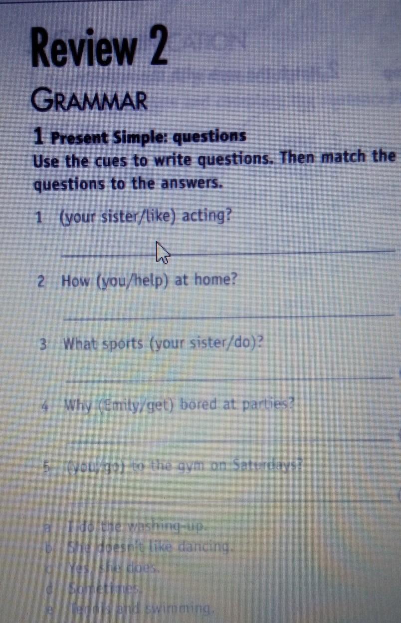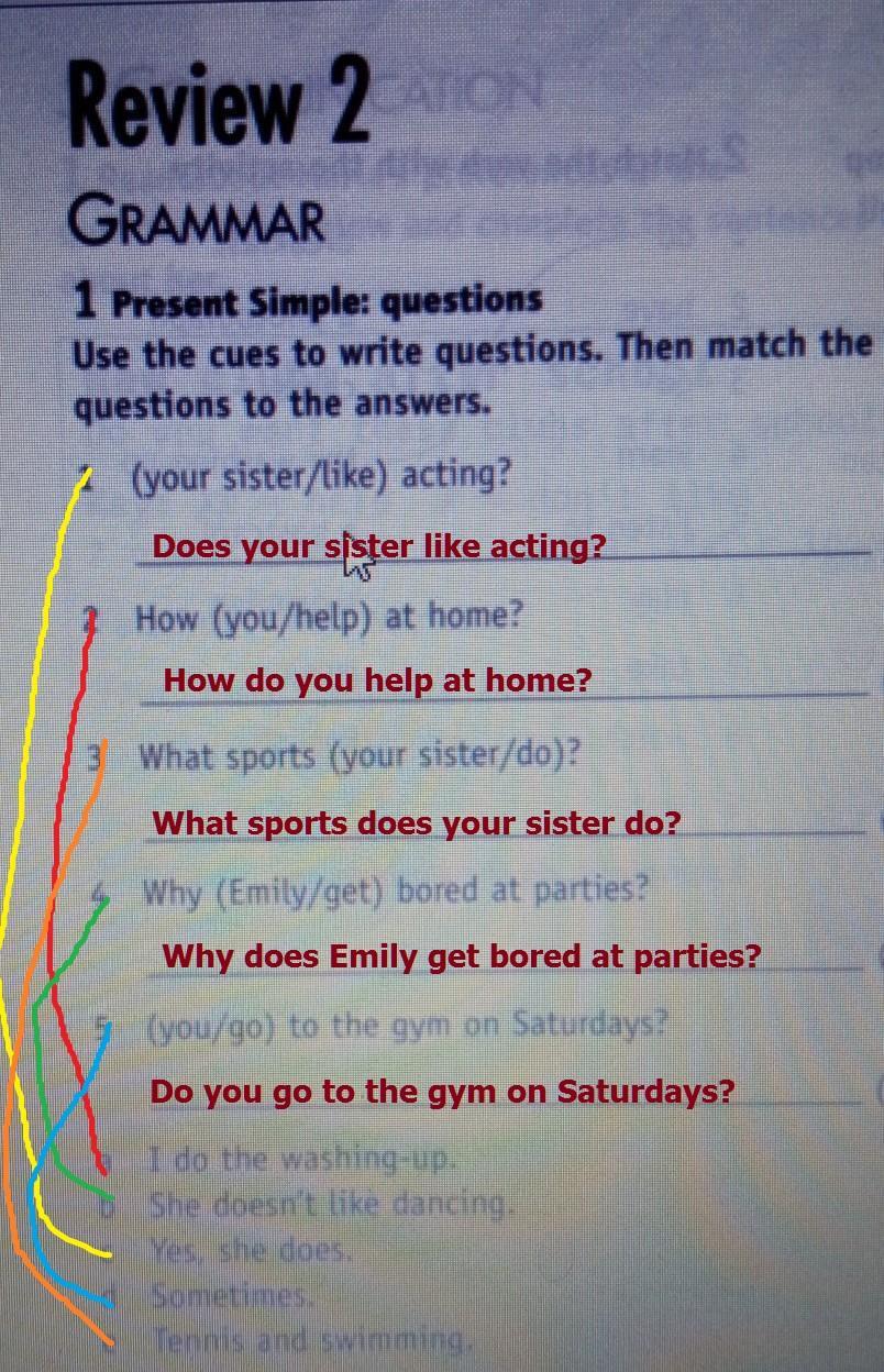 1 Present Simple: questions Use the cues to write questions. Then match the questions to the answers. 1 your sister like) acting? 2. How you/help) at home? 3. What sports (your sister/do)? 4 Why (Emily/get) bored at parties? 5. you go to the gym on Saturdays?