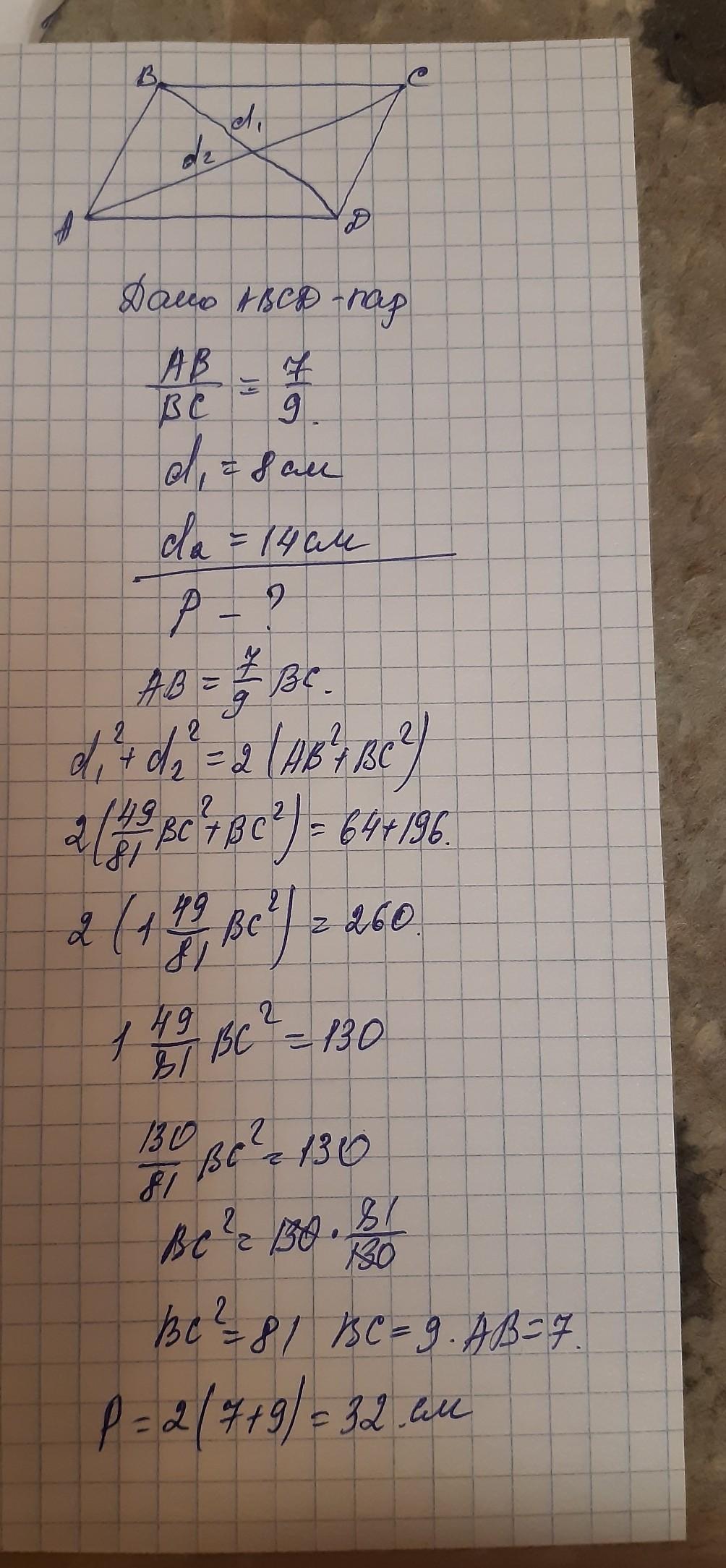 діагоналі паралелограма дорівнюють 8 см і 14 см, а сторони відносяться як 7:9.Обчислити периметр паралелограма.