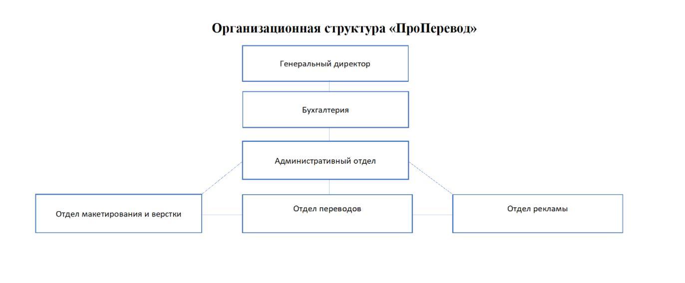 Если они подчинены Административному отделу, то тогда наклонные пунктирные линии необходимо заменить сплошными Г-образными, а на нижнем уровне управления горизонтальные сплошные линии либо совсем убрать (так как все 3 отдела подчинены одному начальнику), либо заменить их пунктирными, если в процессе работы 2 этих отдела обязаны согласовывать свои действия с Отделом переводов.