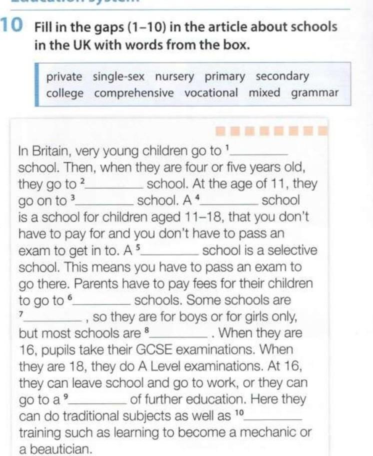 10 Fill in the gaps (1-10) in the article about schools in the UK with words from the box.