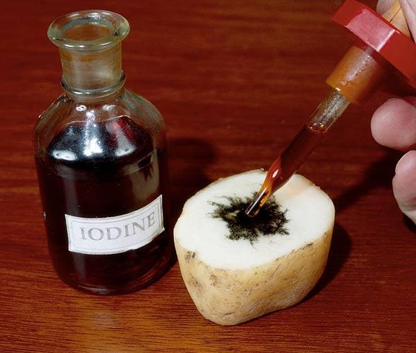 Если капнуть на сырой картофель, то окрашивание проявится.