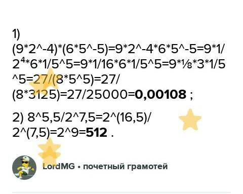 1. (9·2⁻⁴)·(6·5⁻⁵)=3²/2⁴ ·(2·3)/5⁵=(3/2)³·1/5⁵=1,5³·1/5⁵=(0,3·5)³·1/5⁵=(3/10)³ ·1/5²=27/25000=0,00108