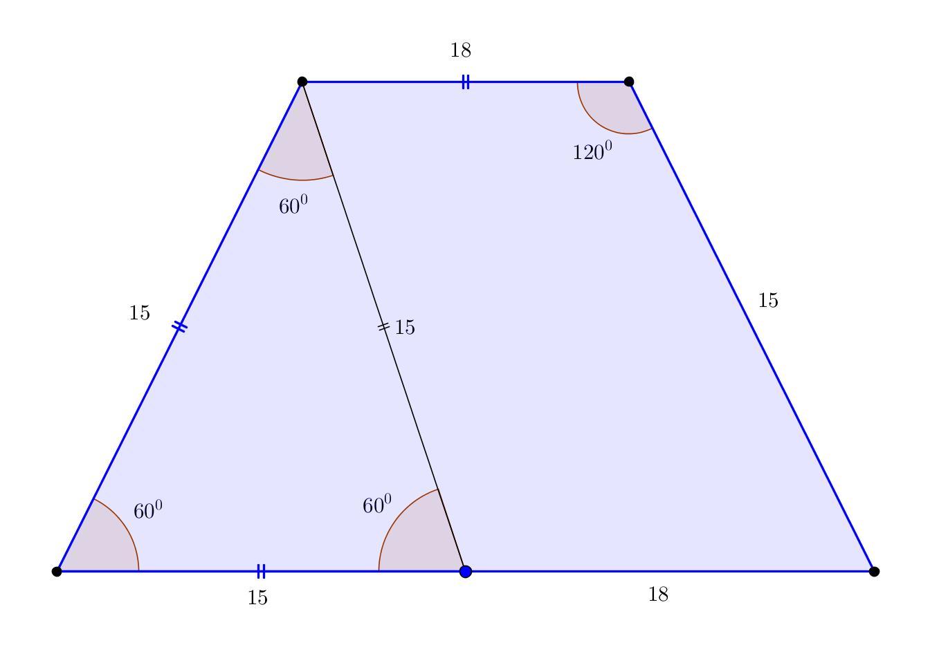 У рівнобічної трапеції з тупим кутом 120° і меншою основою 18 см через вершину тупого кута проведено пряму, яка паралельна до бічної сторони і відтинає від більшої основи відрізок завдовжки 15 см. Знайди бічну сторону трапеції.