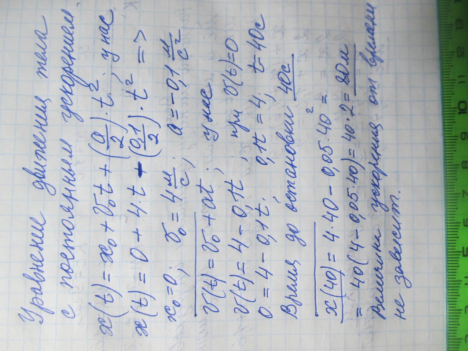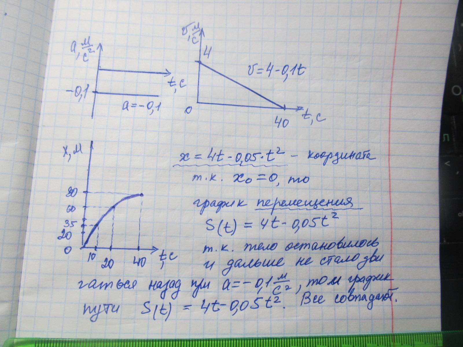 Отсюда, начальная скорость v0 = a = 4 м/с, а ускорение (обозначим за g) g = -0.05 м/с^2