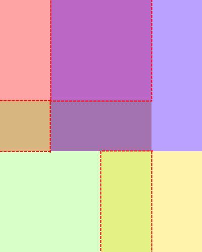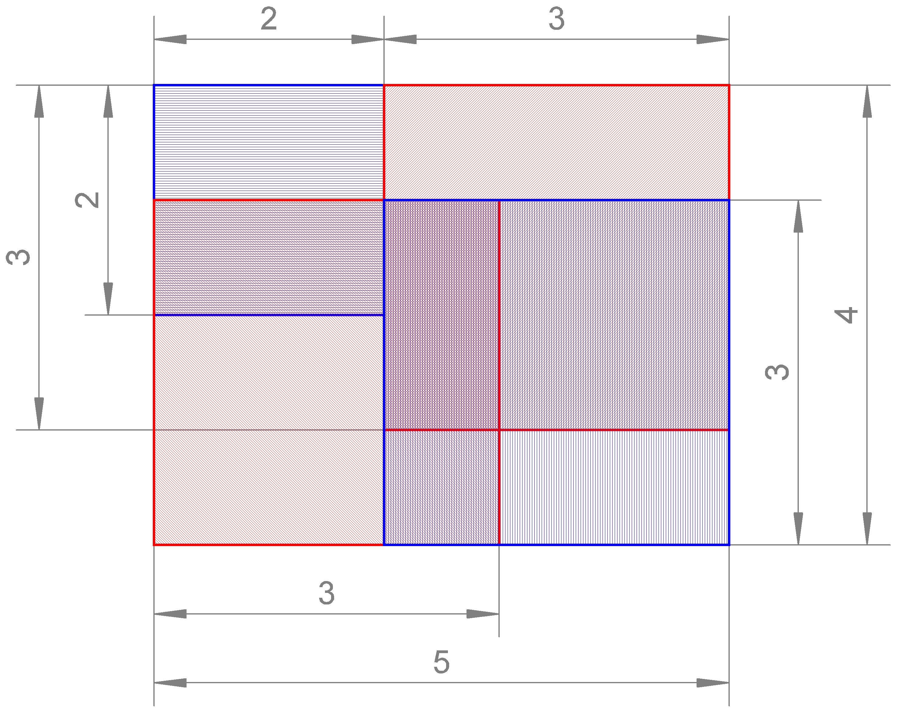 Смотрим на чертёж всего этого безобразия (на картинке внизу, сделано в масштабе, два ковра- синим, два ковра- красным), и видим, что есть следующие области перекрытия ковров: