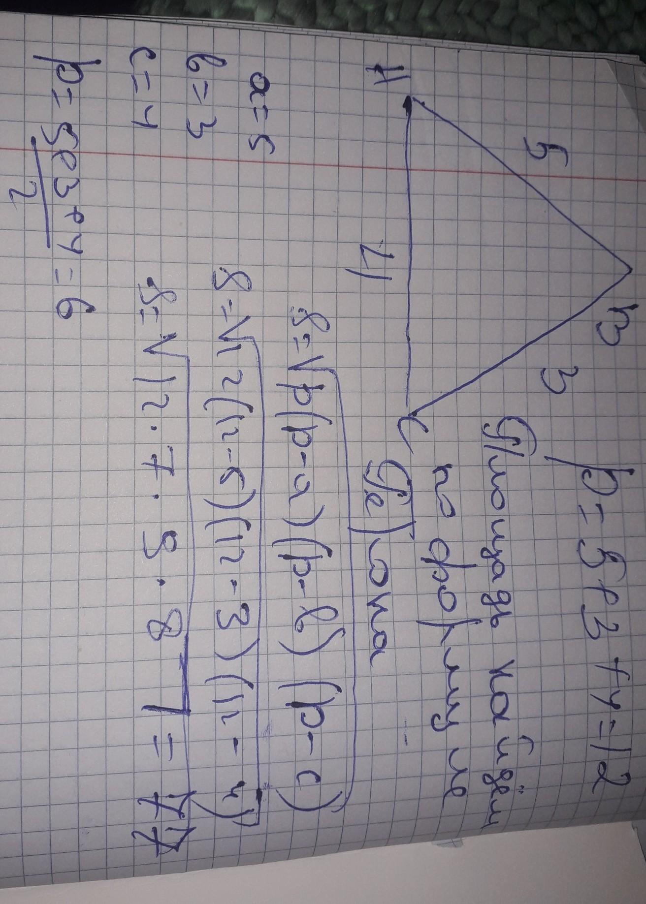 S = √p * (p - a)(p - b)(p - c), где a, b и c это стороны треугольника и p - это 1/2 периметра треугольника.
