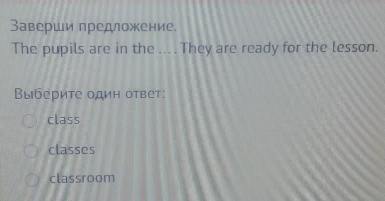 The pupils are in the. ... They are ready for the lesson. 1) class 2) clases 3) classroom