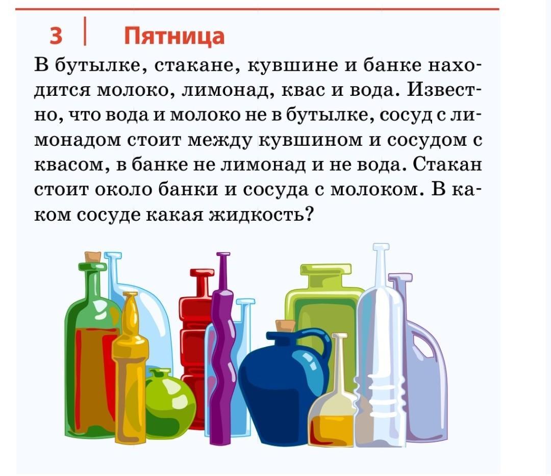 Банка - квас, бутылка - лимонад, стакан - вода, кувшин - молоко