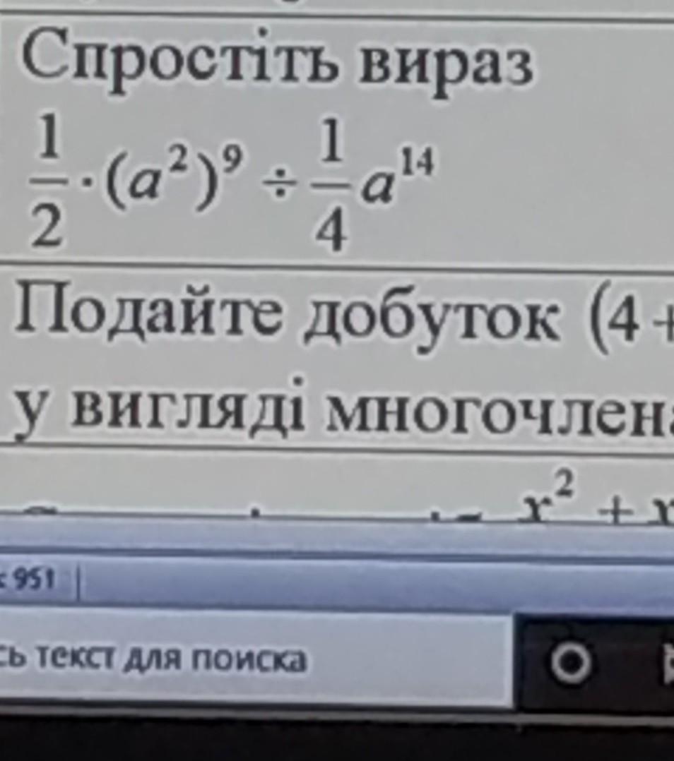 1/2 * a^18 : 1/4 a^14 = 1/2* a^4 :1/4 = 2a^4 кажется так. Есть такой ответ? Решала в уме, потому может быть не точно.