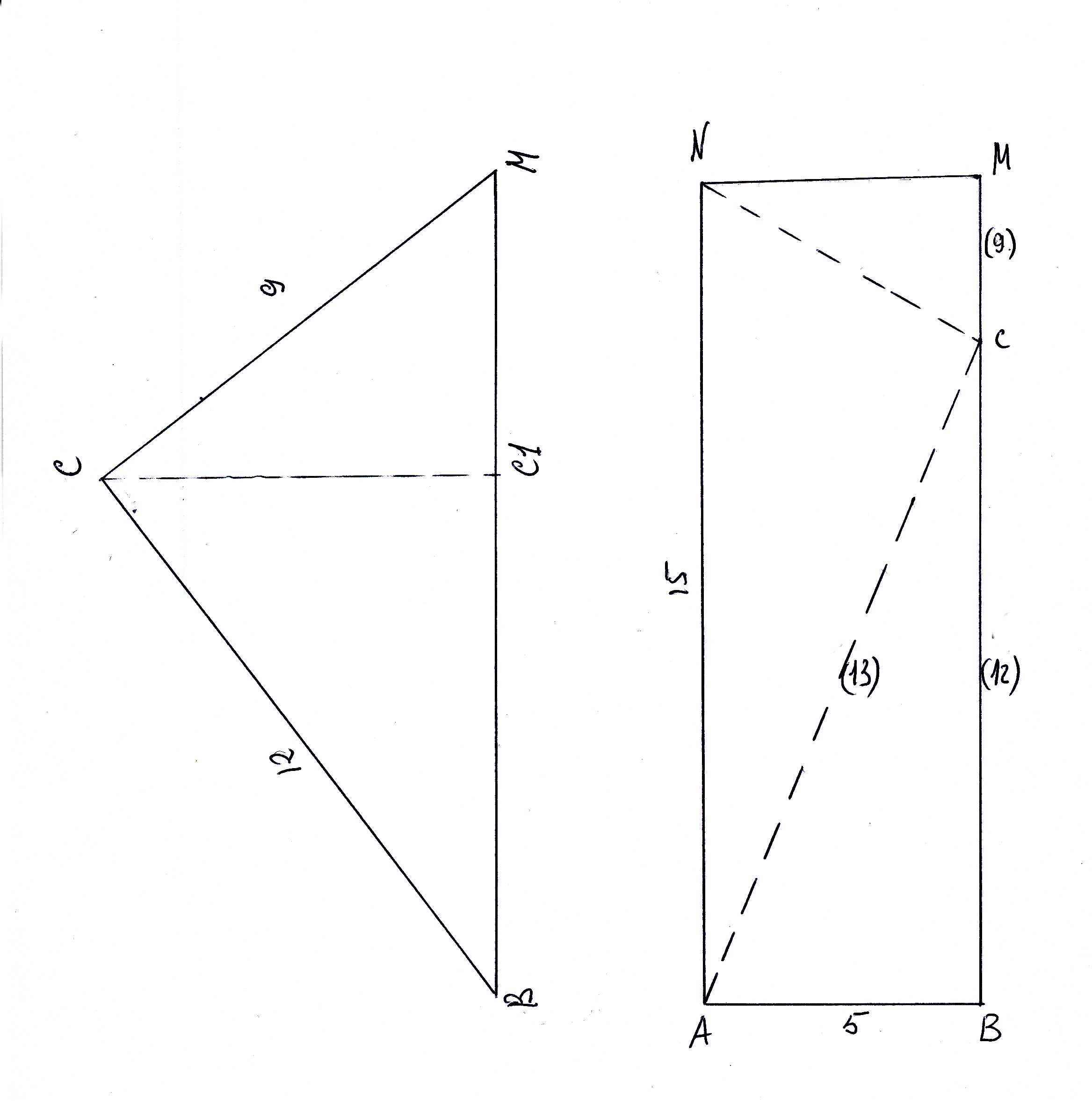В прикрепленном файле показан "вид сверху" на прямоугольник MNBA. Треугольник АВС наклонен (вершина С БЛИЖЕ к нам, чем плоскость прямоугольника) Размеры взяты в скобки, потому что соответствуют наклонным отрезкам. Рядом показан вид сбоку, на треугольник ВСМ.