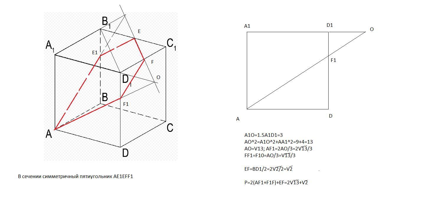 Куб ABCDA1B1C1D1 пересечен плоскостью , проходящей через вершину и точки E,F, являющиеся серединами ребер B1C1 и C1D1 . Найти периметр сечения, если ребро куба равно 2.
