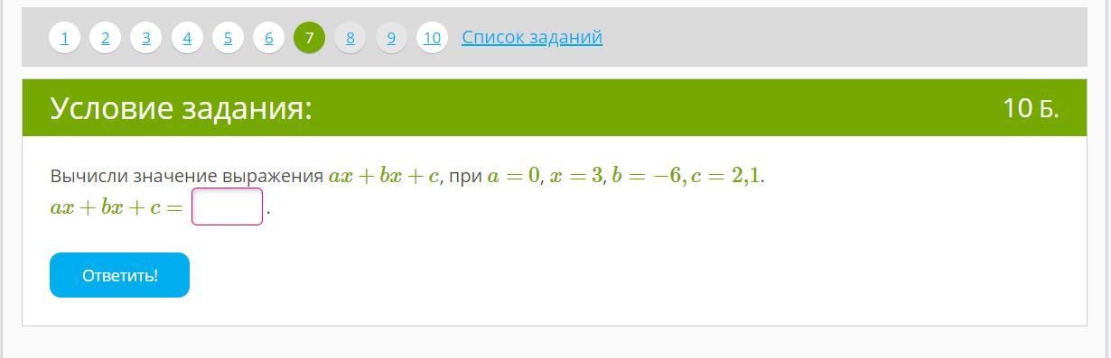 3) ax + bx + c = 0 * 3 + (- 6) * 3 + 2,1 = 0 - 18 + 2,1 = - 15,9