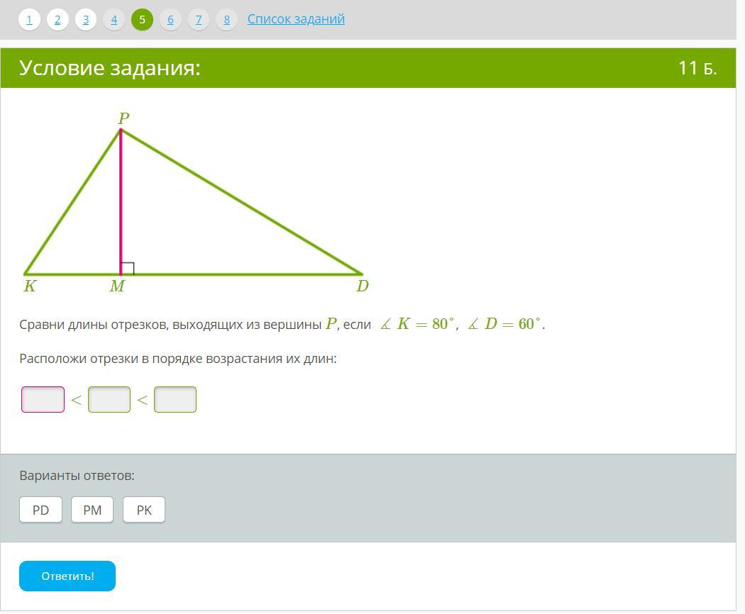 1) В треугольнике против бОльшего угла лежит большая сторона, поэтому против ∠К=80° лежит сторона РД, которая будет больше, чем сторона РK, лежащая против угла в 60° : PD>PK или PK<PD .