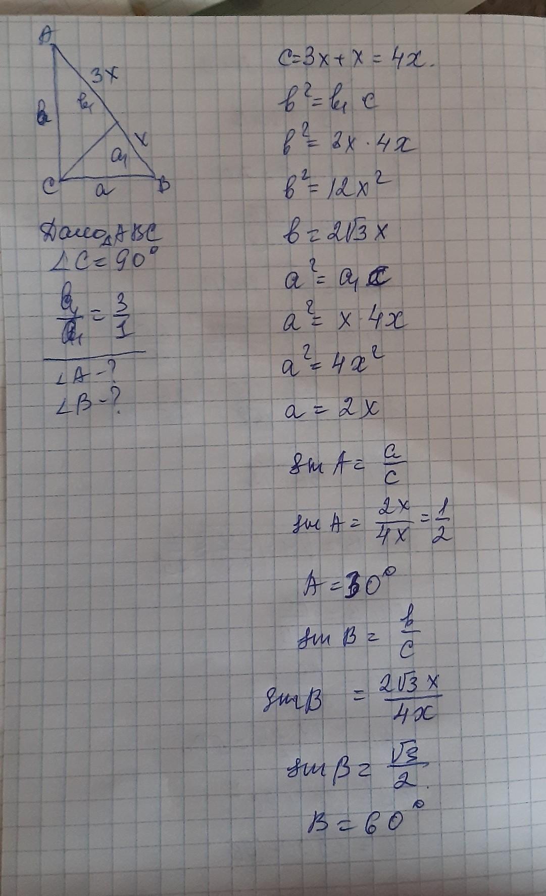 3) тр-к АВС АН=х ; НВ=3х ; пусть АC=b ; BC=a ; AB=c; СН=h.