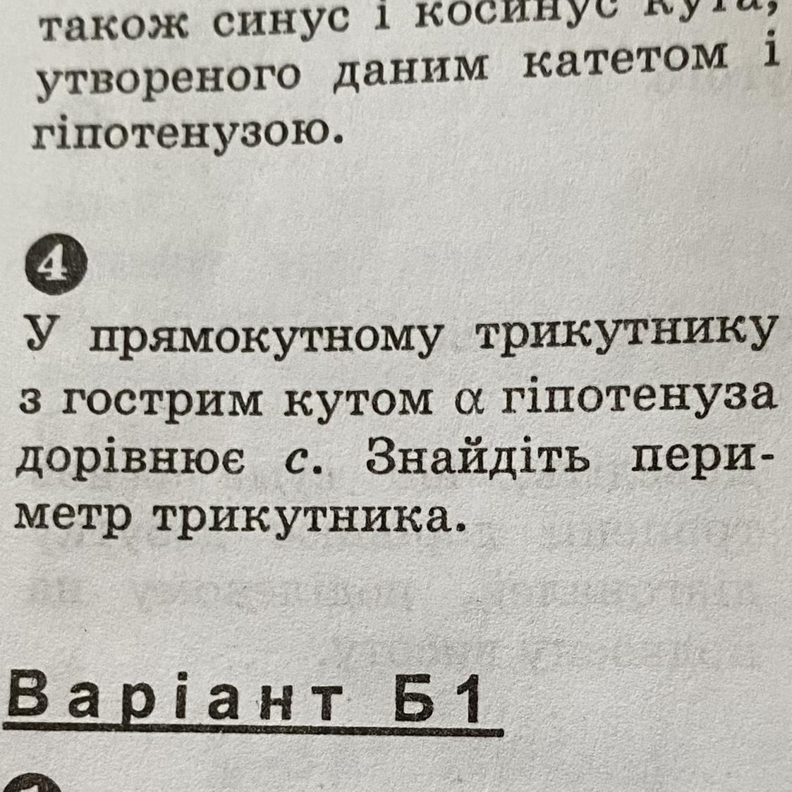Периметр це сума всіх сторін, якщо відомий кут прямокутного трикутника і сторона, скористаємося формулою: