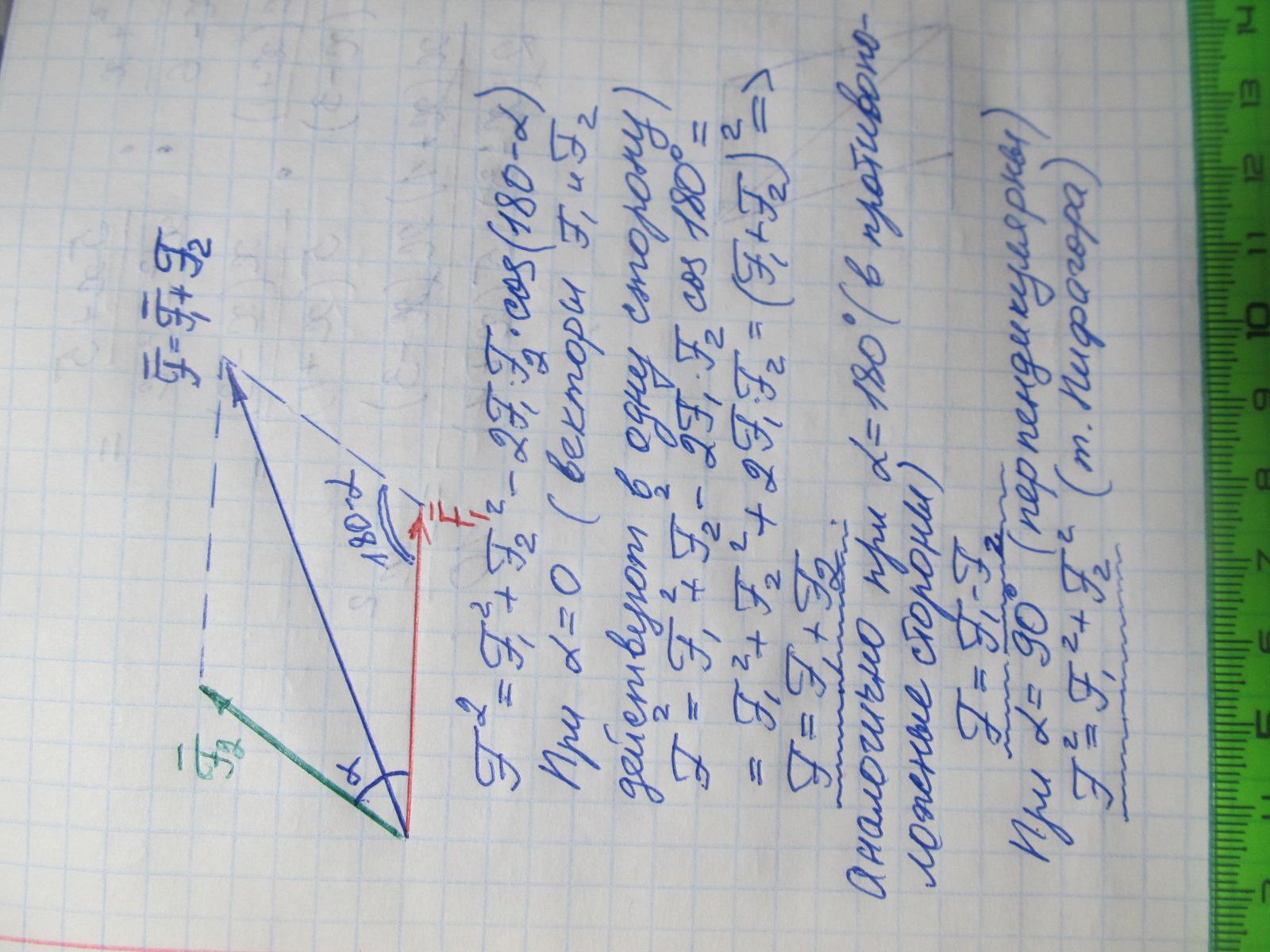 Величину равнодействующей силы, от двух сил действующих из одной точки на одно тело определяют по формуле: ...(напишите формулу)