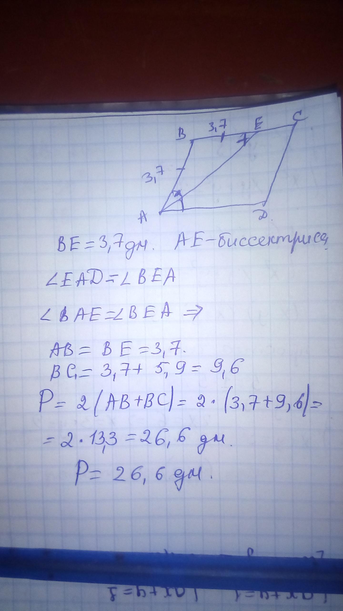 В паралелограмі бісектриса кута ділить протилежну сторону на відрізки 3.7дм і 5.9 дм Обчислити периметр паралелограма