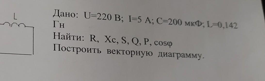 Решите задачу: R с C Дано: U=220 В; I=5 А; С=200 мкФ; L=0, 142 Гн Найти: R, Xc, S, Q, P, cosф Построить векторную диаграмму.