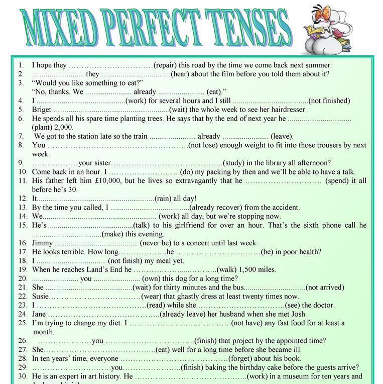11. will have spent 17. has he been 27. had been eating 28. will forget 29. Will you finish