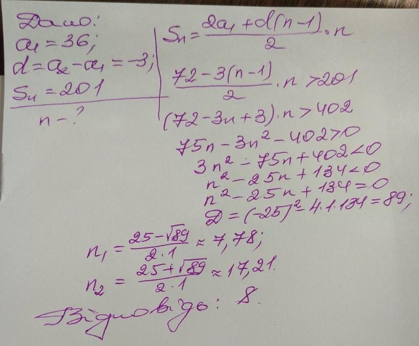 Найти наименьшее количество последовательных членов арифметической прогрессии 36, 33, 30, …, начиная с первого, надо сложить, чтобы получить сумму, большую 201?