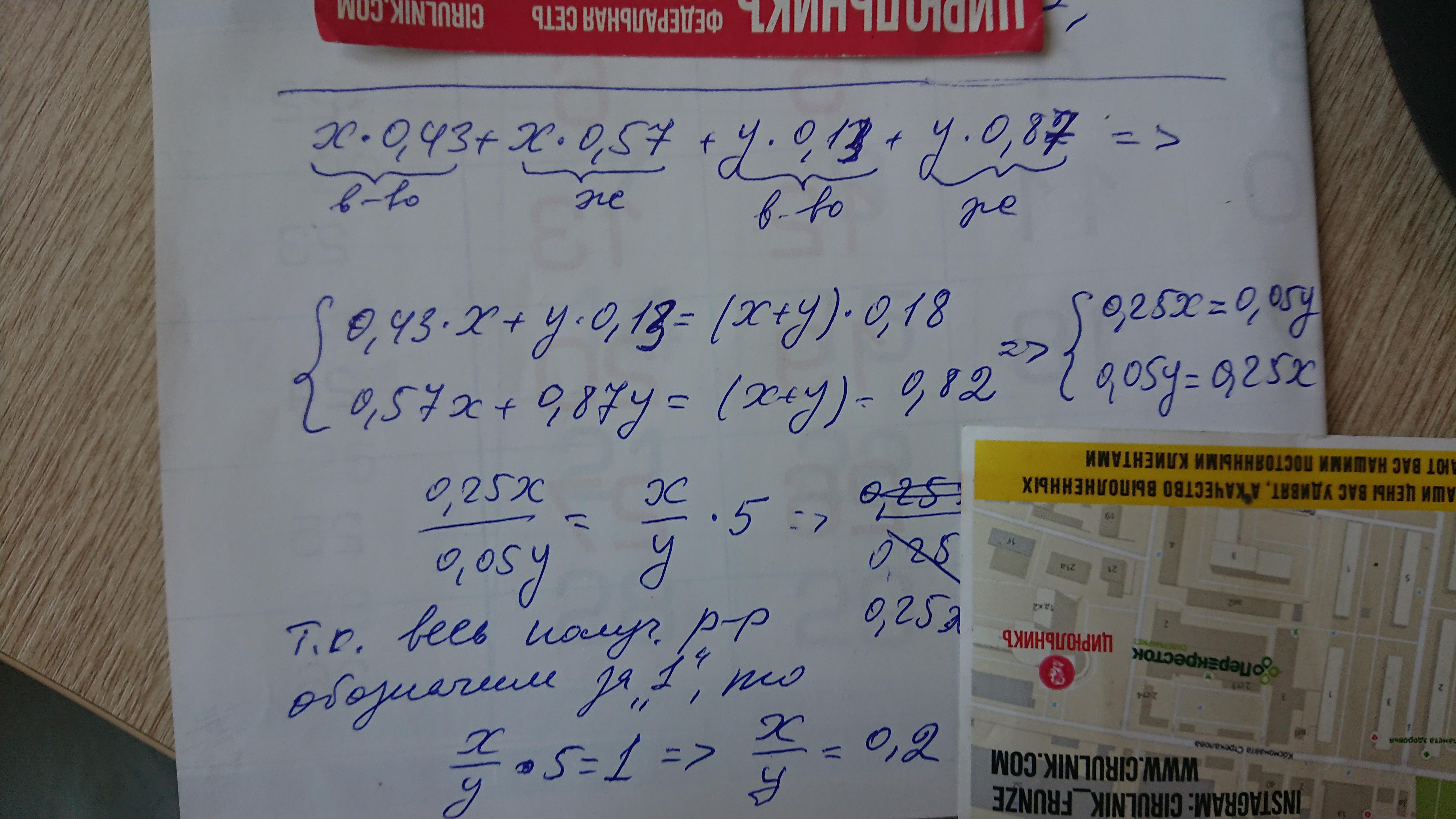 0,43•х + 0,13•у = 0,18•(х + у)