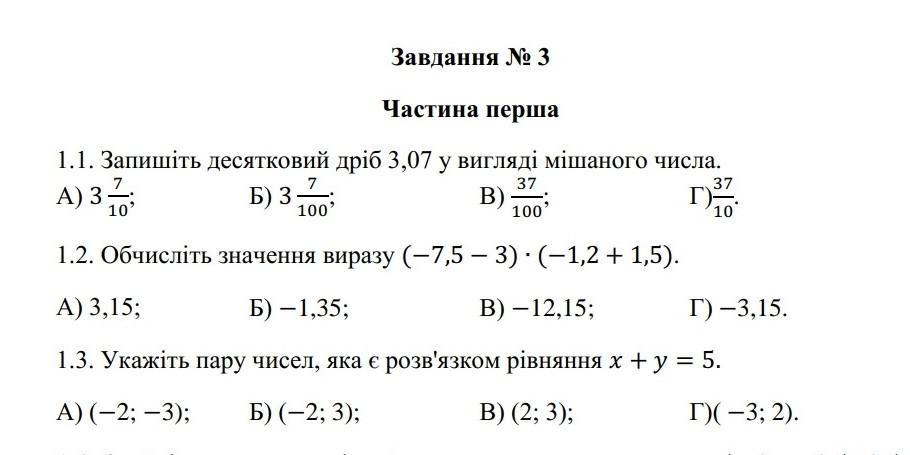 1.1. Запишiть дрiб 3,07 у вигладi мiшаного числа. Вiдповiдь : Б) 3 7/100.