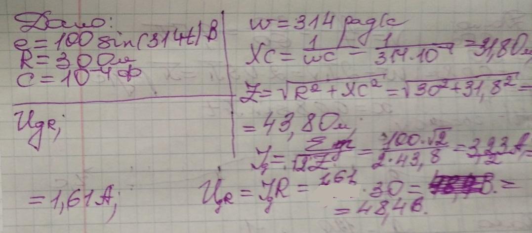 Для представленной цепи задано: e=100sin(314t) В; R=30 Ом; С=100 мкФ.