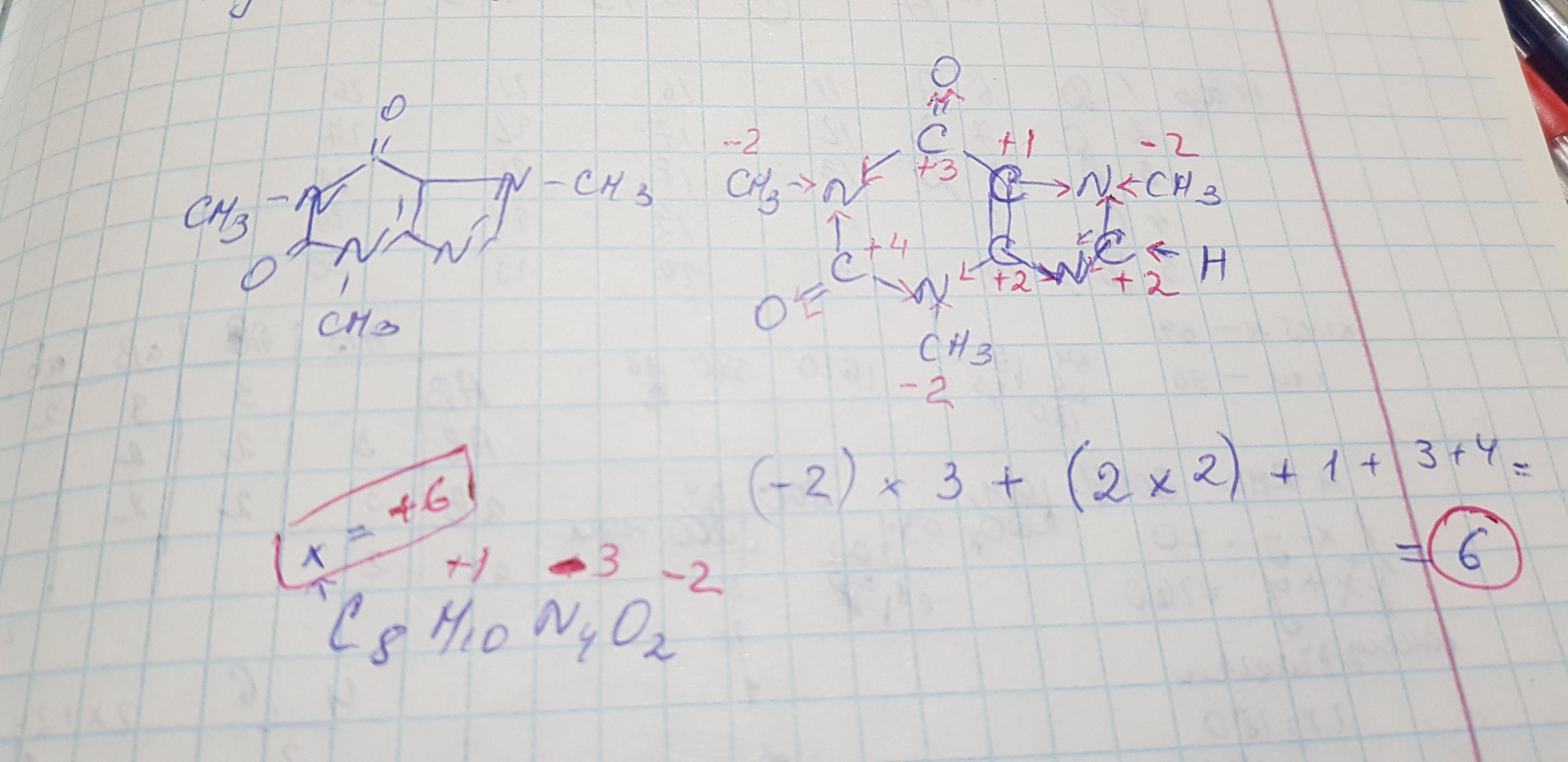 1 - способ: нужно найти степень окисления каждого атома углерода и затем прибавить их в раскрытой формуле кофеина.