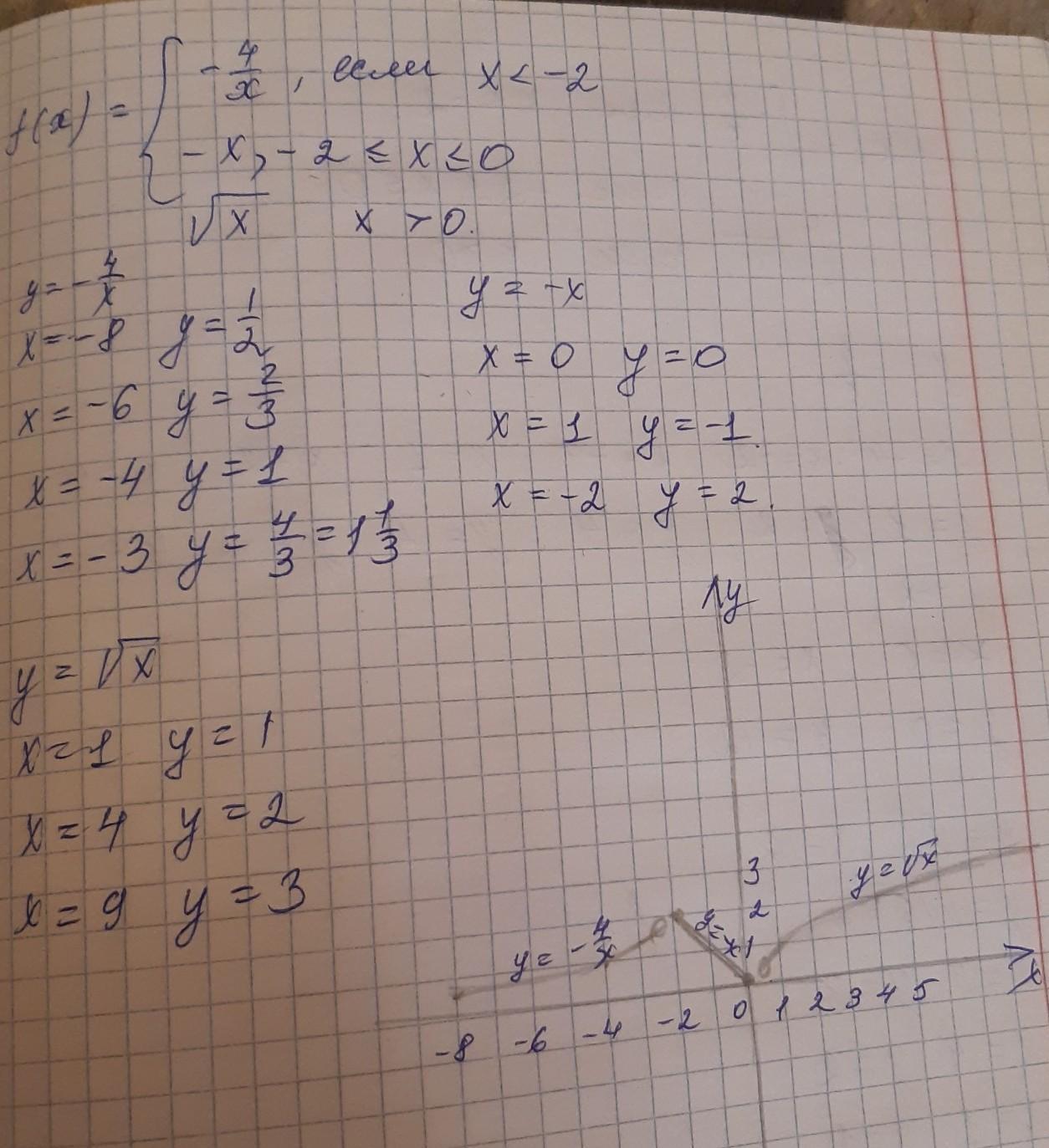 Например: берем х = -4. Он относится к промежутку х < -2, значит подставляем его в первую формулу. Получится 2. Ставим точку (-2, 2) где первая координата по х, вторая по у.