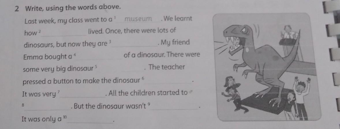 слова должны быть:dinosaur, model, skeleton roar , scary, scream alive dead robot