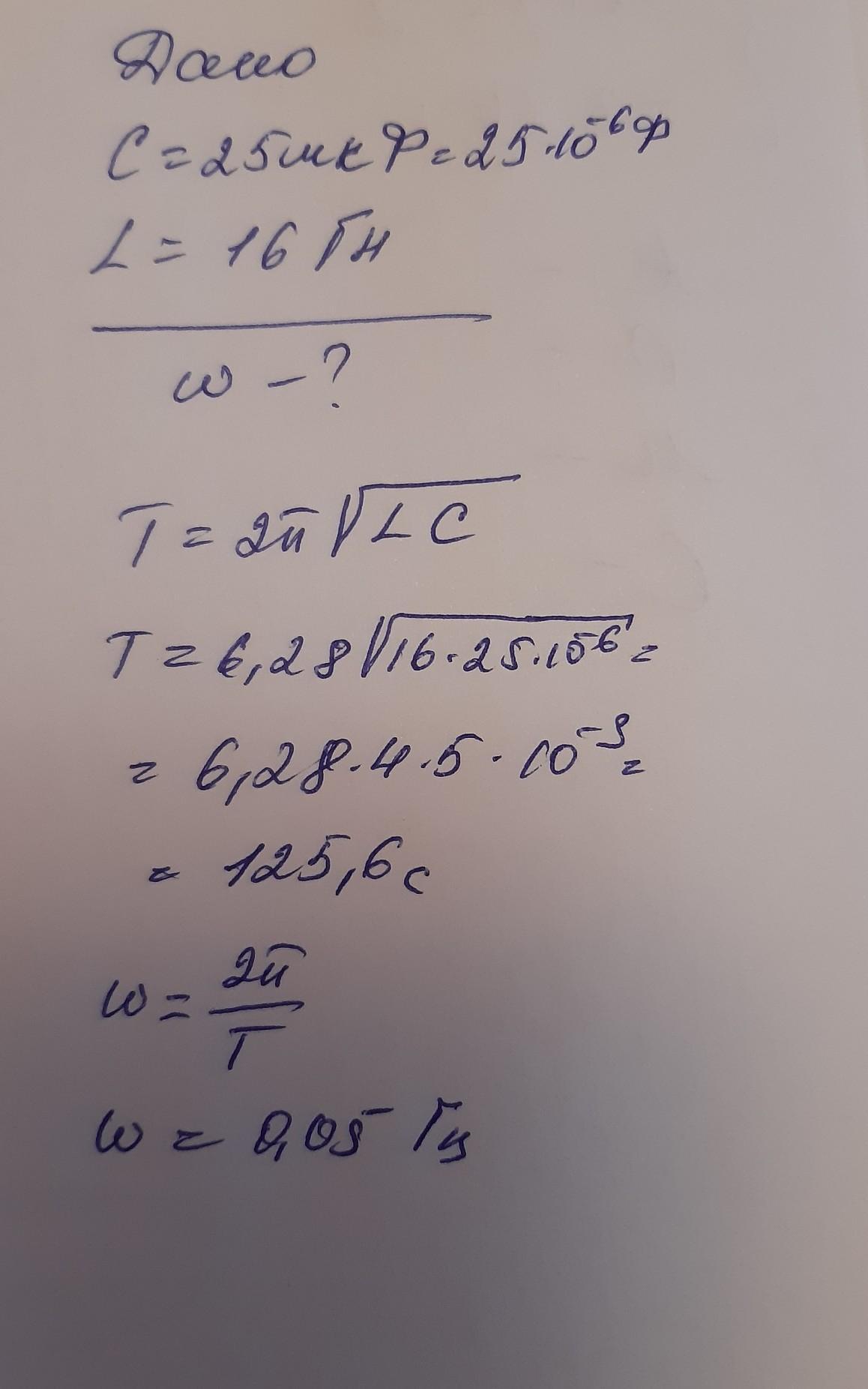 Колебательный контур состоит из конденсатора электроемкостью 25 мкФ и катушки индуктивностью 16 гц. Чему равна циклическая частота со свободных электромагнитных колебаний
