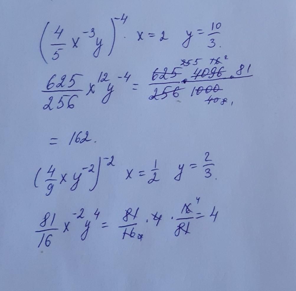 9 . ( 4/5 x⁻³y )⁻⁴= ( 4/5 )⁻⁴ *x¹²y⁻⁴= 5⁴/4⁴ *x¹²/y⁴ = [ x = 2 ; y = 10/3 ] = 5⁴/4⁴ * (3⁴ *2¹²)/10⁴ =
