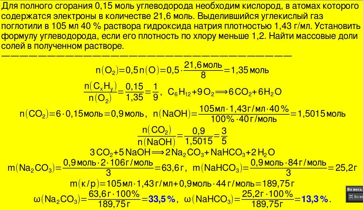 для полного сгорания углеводорода химическим количеством 0,15 моль потребовалась порция кислорода, содержащая в атомах 21,6 моль электронов. выделившийся углекислый газ поглотили раствором гидроксида натрия объемом 105 см³ (p = 1,43 г/см³) с массовой долей щелочи 40%. найдите: а) формулу углеводорода (относительная плотность его паров по хлору меньше 1,2); б) массовые доли солей в полученном растворе.