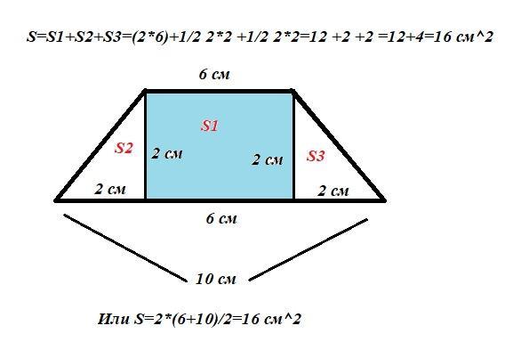 по углам равные равнобедренные треугольники, внутри прямоугольник. Сторона треугольника=высота трапеции=(10-6)/2=2; Площадь трапеции = (10+6)*2/2=16 см^2;