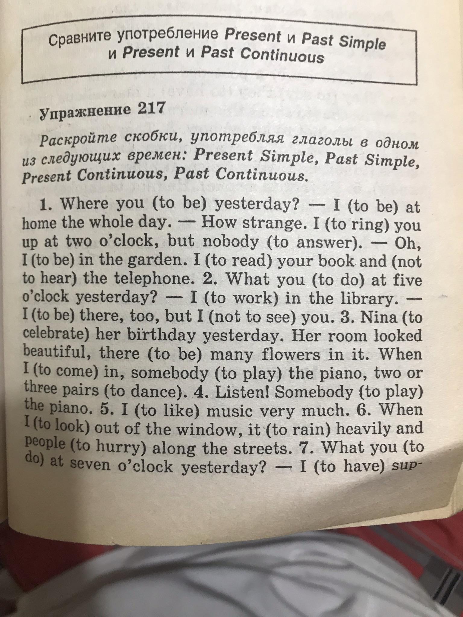 1. Where were you yesterday? - I was at home the whole day. - How strange. I rang you up at two oʻclock, but nobody answered. - Oh, I was in the garden. I was reading your book and didnʻt hear the telephone. 2. What were you doing at five oʻclock yesterday? - I was working in the library. - I was there, too, but I didnʻt see you. 3. Nina celebrated her birthday yesterday. Her room looked beautiful, there were many flowers in it. When I came in, somebody was playing the piano, two or three pairs were dancing. 4. Listen! Somebody is playing the piano. 5. I like music very much. 6. When I looked out of the window, it was raining heavily and people were hurring along the streets. 7. What were you doing at seven oʻclock yesterday? - I ...